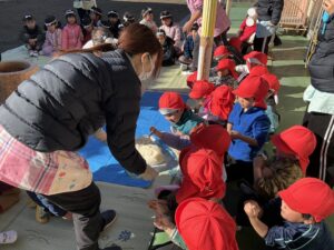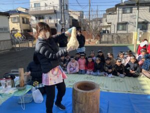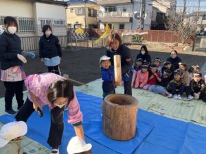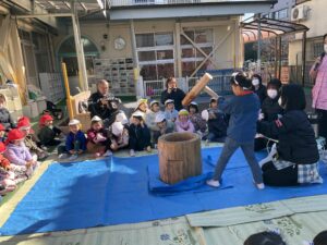 まずは園長先生がおもちのつきかたを見本として見せてくれました!