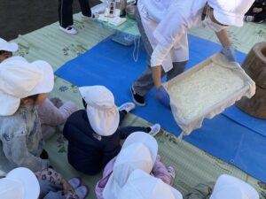 炊き上がったもち米を厨房さんが持ってきてくれると目を輝かせて見つめるみんな✨